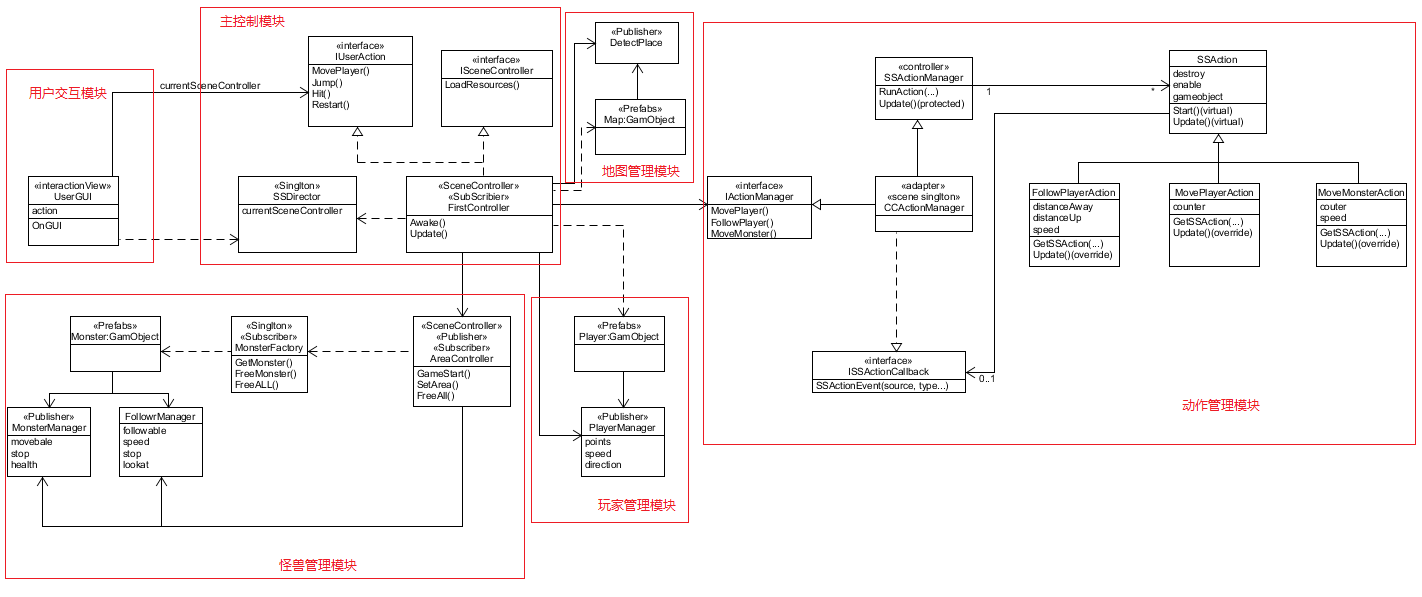 接收玩家交互后产生的信息并进行相应处理public class FirstController : MonoBehaviour, ISceneController, IUserAction { GameObject map; //地图管理 GameObject player; //玩家管理 UserGUI userGUI; //用户交互 IActionManager actionManager; //动作管理 AreaController areaController; //怪兽管理 void Start() { SSDirector.GetInstance().CurrentScenceController = this; gameObject.AddComponent<MonsterFactory>(); gameObject.AddComponent<AreaController>(); areaController = Singleton<AreaController>.Instance; gameObject.AddComponent<CCActionManager>(); gameObject.AddComponent<UserGUI>(); userGUI = Singleton<UserGUI>.Instance; actionManager = Singleton<CCActionManager>.Instance; LoadResources(); GameObject.FindWithTag("MainCamera").AddComponent<FollowManager>(); actionManager.FollowPlayer(GameObject.FindWithTag("MainCamera"), 3.5f, 5f, 6); } //订阅各事件 private void OnEnable() { AreaController.followAction += FollowAction; AreaController.monsterMoveAction += MonsterMoveAction; AreaController.victory += Victory; PlayerManager.dealDamage += DealPlayerDamage; MonsterManager.dealDamage += DealMonsterDamage; DetectPlace.setArea += SetArea; } //取消订阅 private void OnDisable() { AreaController.followAction -= FollowAction; AreaController.monsterMoveAction -= MonsterMoveAction; AreaController.victory -= Victory; PlayerManager.dealDamage -= DealPlayerDamage; MonsterManager.dealDamage -= DealMonsterDamage; DetectPlace.setArea -= SetArea; } //加载资源 public void LoadResources() { if (map == null) map = GameObject.Instantiate<GameObject>(Resources.Load<GameObject>("Prefabs/Map"), Vector3.zero, Quaternion.identity); if (player == null) { player = GameObject.Instantiate<GameObject>(Resources.Load<GameObject>("Prefabs/SapphiArtchan"), Vector3.zero, Quaternion.identity); player.AddComponent<PlayerManager>(); } player.GetComponent<PlayerManager>().health = 10; userGUI.SetPlayerHealth(10); userGUI.SetPoints(0); player.transform.position = new Vector3(6, -1.5f, 5); actionManager.MovePlayer(player, 0, 0); } //处理胜利事件 public void Victory() { if (userGUI.gameOver|| userGUI.victory) return; userGUI.victory = true; areaController.FreeAll(); player.GetComponent<PlayerManager>().moveable = false; player.GetComponent<PlayerManager>().Win(); } //处理玩家受伤事件 public void DealPlayerDamage(GameObject sender) { userGUI.SetPlayerHealth(sender.GetComponent<PlayerManager>().health); if (sender.GetComponent<PlayerManager>().health == 0) { areaController.FreeAll(); sender.GetComponent<PlayerManager>().moveable = false; userGUI.gameOver = true; userGUI.victory = false; } } //处理怪兽受伤事件 public void DealMonsterDamage(GameObject sender) { userGUI.SetMonsterHealth(sender.GetComponent<MonsterManager>().health); userGUI.AddPoints(sender.GetComponent<MonsterManager>().health == 0 ? 2 : 1); } //玩家移动 public void MovePlayer(float speed, float direction) { if (player.GetComponent<PlayerManager>().moveable) actionManager.MovePlayer(player, speed, direction); } //玩家跳跃 public void Jump() { player.GetComponent<PlayerManager>().Jump(); } //玩家攻击 public void Hit() { player.GetComponent<PlayerManager>().Hit(); } //处理怪兽追击事件 public void FollowAction(GameObject follower, float distanceAway, float distanceUp, float speed) { actionManager.FollowPlayer(follower, distanceAway, distanceUp, speed); } //处理怪兽巡逻事件 public void MonsterMoveAction(GameObject monster, float speed) { actionManager.MoveMonster(monster, speed); } //游戏重开 public void Restart() { LoadResources(); player.GetComponent<PlayerManager>().Revive(); areaController.GameStart(); userGUI.gameOver = false; userGUI.victory = false; } //设置玩家区域 public void SetArea(float x, float y) { int playerArea; x += 4.5f; y += 4.5f; if ((int)x == 9 && (int)y == 9) playerArea = -1; else if ((int)x == 9 && (int)y == 0) playerArea = 0; else if ((int)x == 0 && (int)y == 0) playerArea = 1; else if ((int)x == 9 && (int)y == -9) playerArea = 2; else if (((int)x == 0 || (int)x == -9) && (int)y == -9) playerArea = 3; else playerArea = 4; areaController.SetArea(playerArea); } void Update() { } }小结