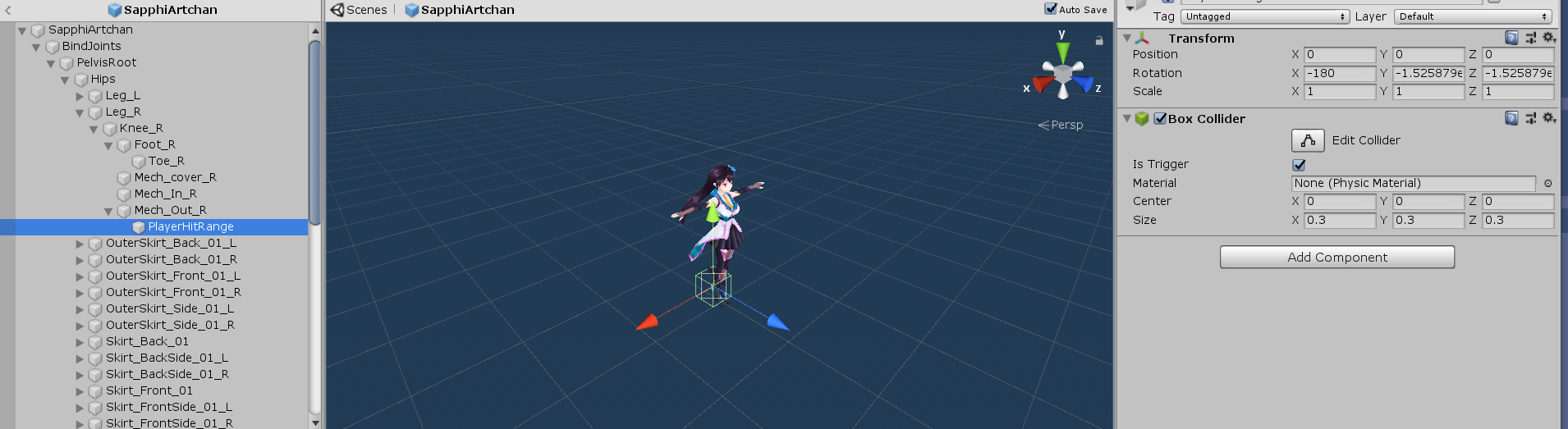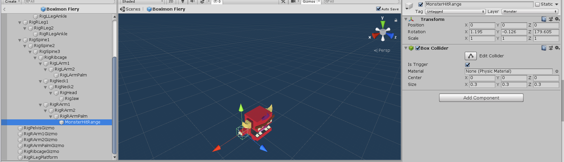 为怪兽的右手添加一个Trigger,当怪兽执行攻击动画时这个Trigger会随着运动,用于进行攻击判定。