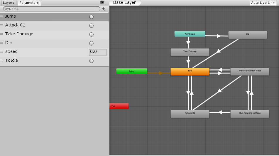 - speed<0.2时播放idle,0.2<speed<0.7时播放Walk Forward in Place,速度>0.7时播放Run Forward In Place